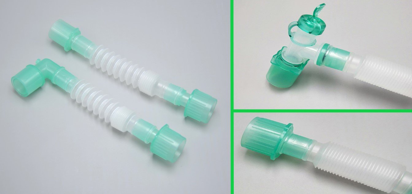 Catheter Mount connects patient ET to breathing circuit. This minimizes the jerk of breathing to ET or TT reducing trauma to trachea.