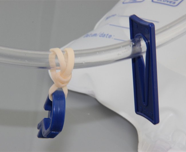 With adjustable bed-sheet clamp for securing drain bag tubing. With tube clamp for stopping the urine flow when required.