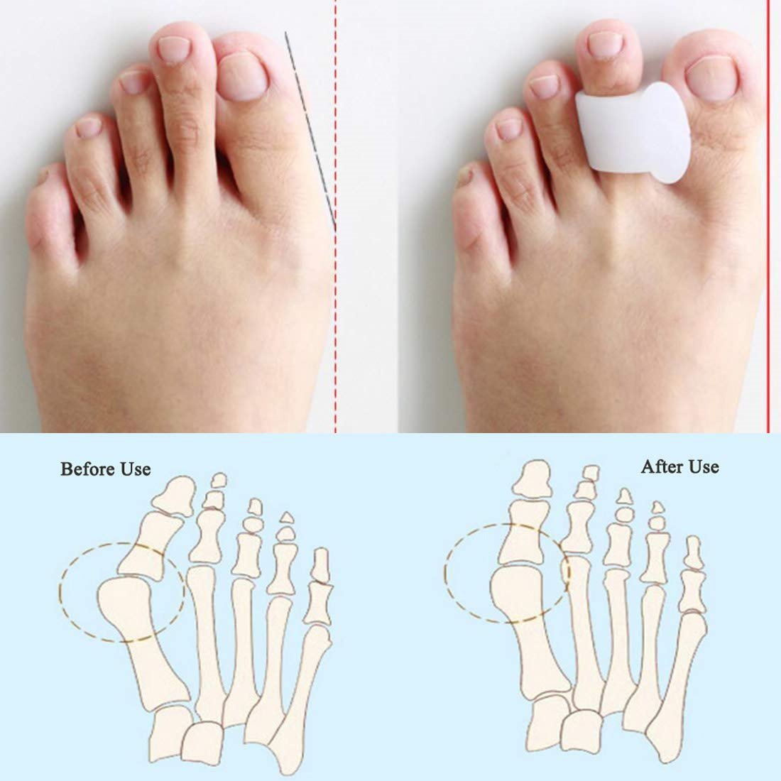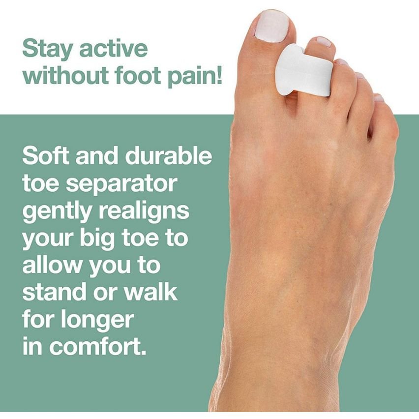Provides non-invasive pain relief from bunions, or hallux valgus, and overlapping toes by gently realigning and straightening your big toe. Our single loop toe spacers separate the toes, straightening the big toe to relieve pressure from the bunion.